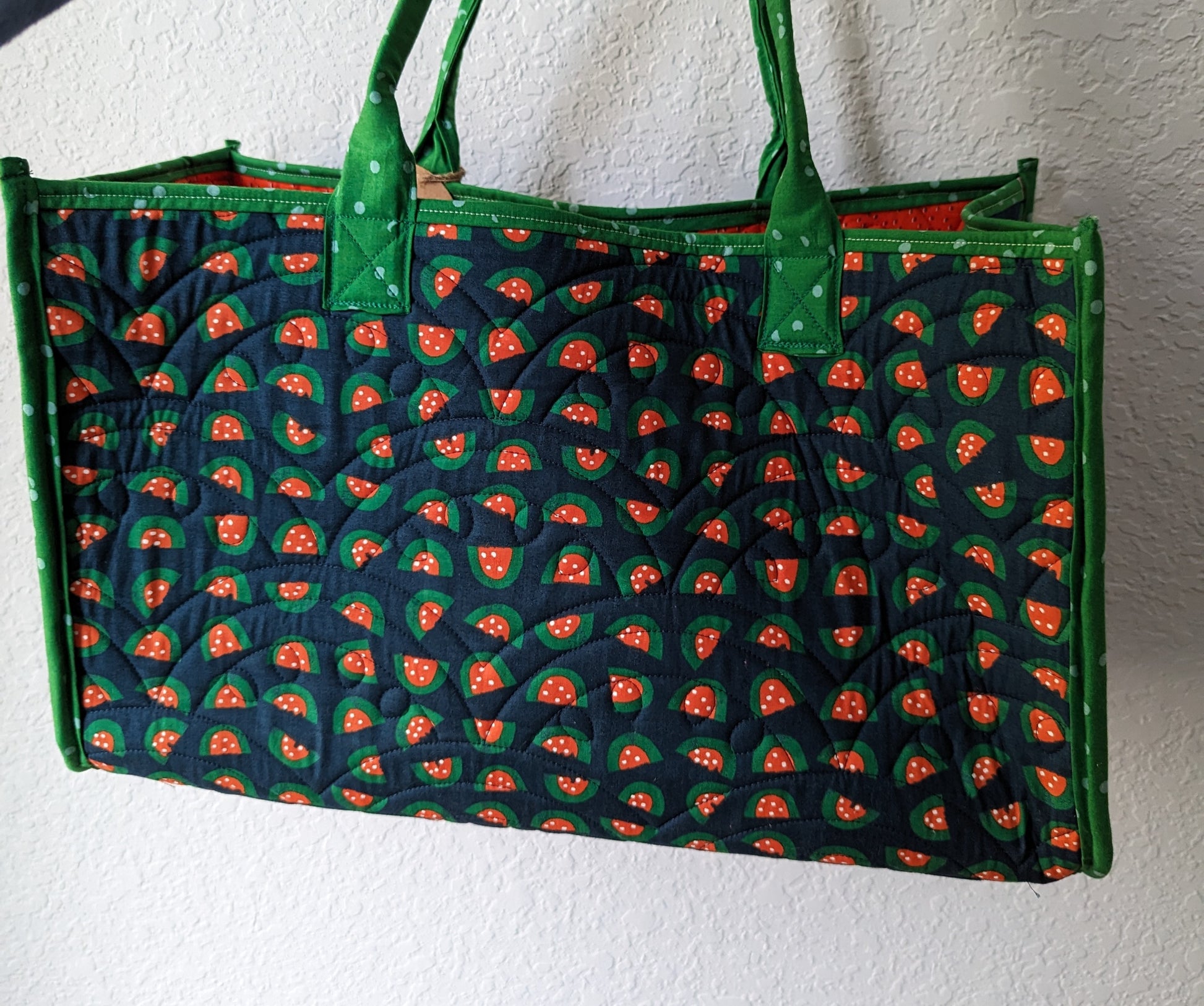 With sturdy covered handles and two side pockets, this quilted tote bag is perfect for the Farmer's Market, a day at the park, or even your next roadtrip!