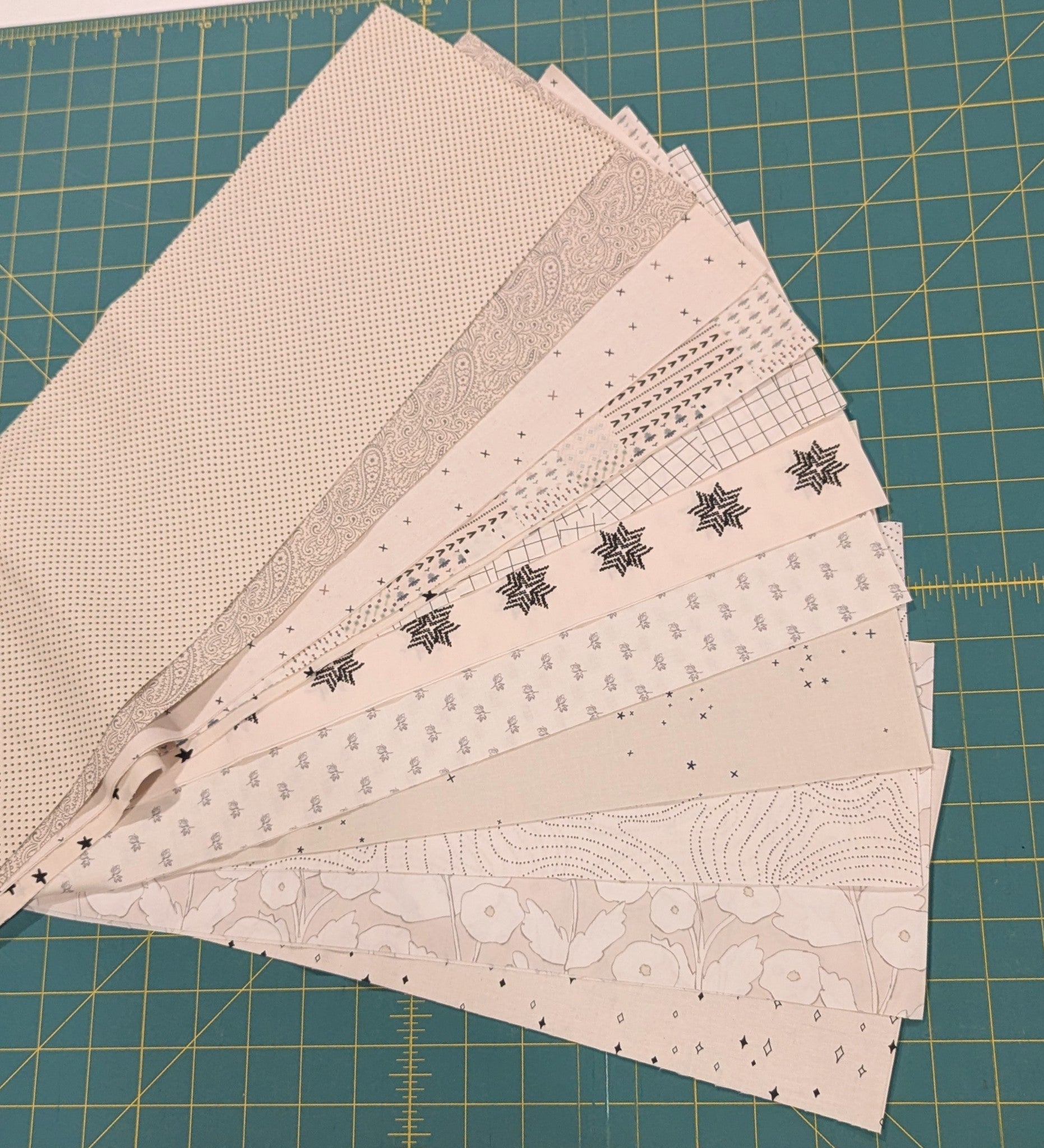 12 different fabric strips, hand cut at 6" x WOF ready for your next scrappy adventure!