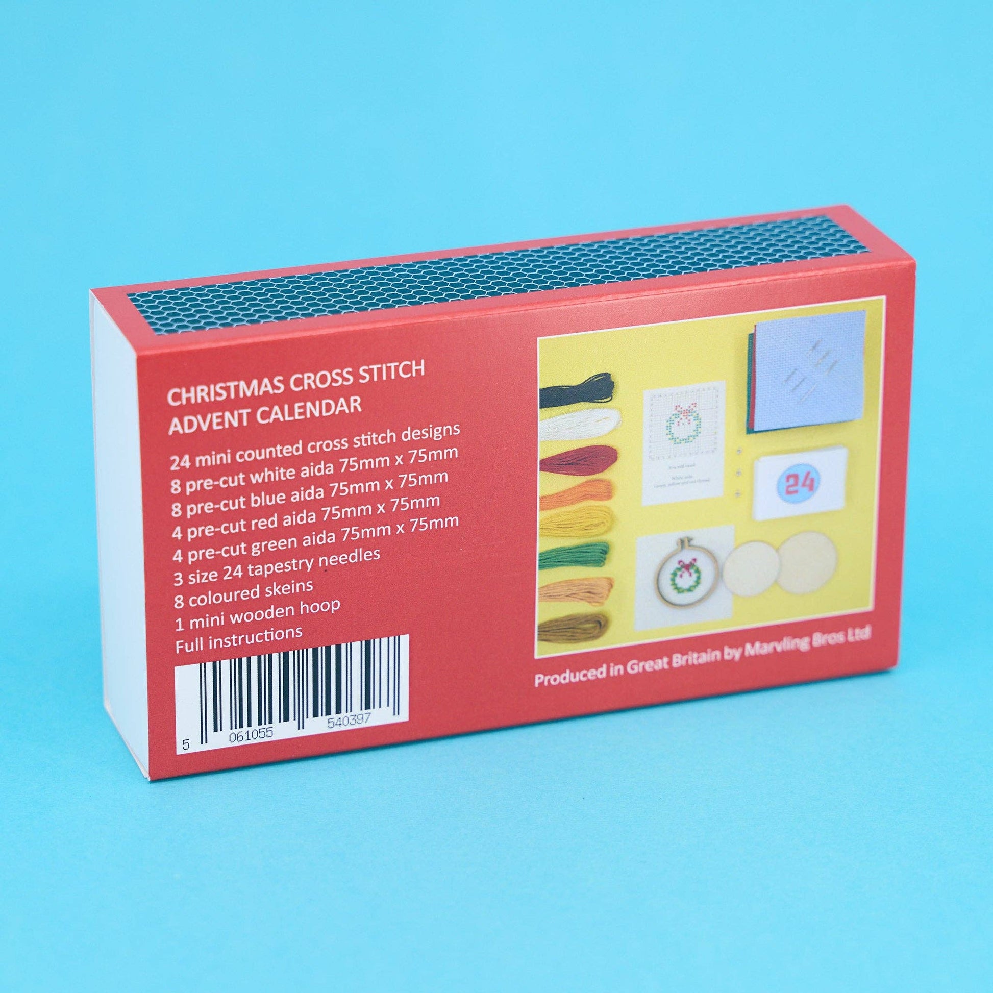 Introducing our Christmas Cross Stitch Advent Calendar, the perfect way to count down to Christmas with a touch of handmade charm. Each day in December, discover a delightful mini cross stitch project, from jolly elves to candy canes, designed to bring festive cheer into your home. This unique advent calendar not only adds a creative twist to your holiday traditions but also offers the joy of crafting together, making it a wonderful gift for crafters and Christmas enthusiasts alike. Beautifully presented in a cooks-sized matchbox, this Christmas Cross Stitch Advent Calendar includes everything needed to complete 24 beautiful designs. Inside you'll find 24 numbered festive patterns, 24 colourful squares of ready-cut Aida fabric, 8 skeins of stranded cotton, and 3 tapestry needles.