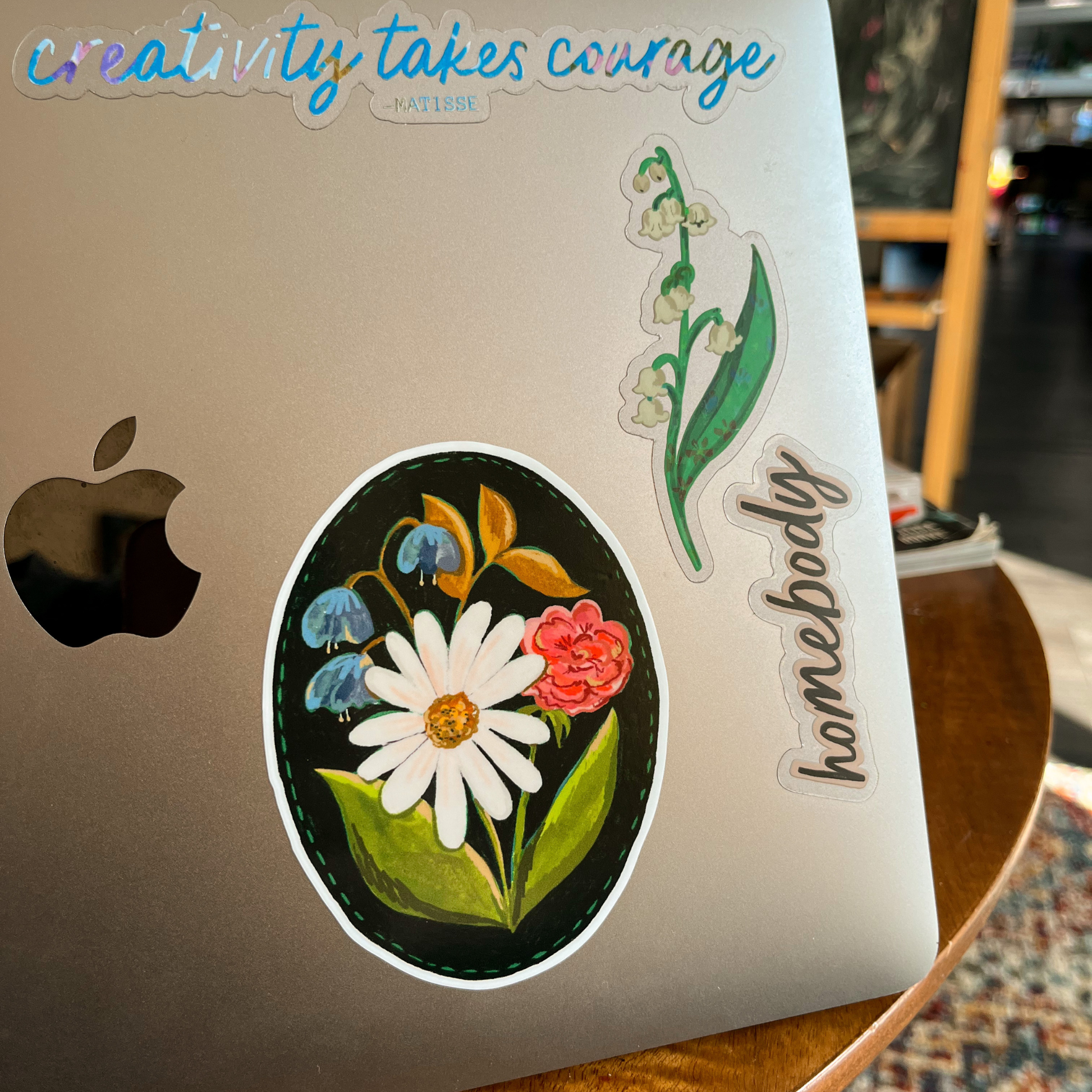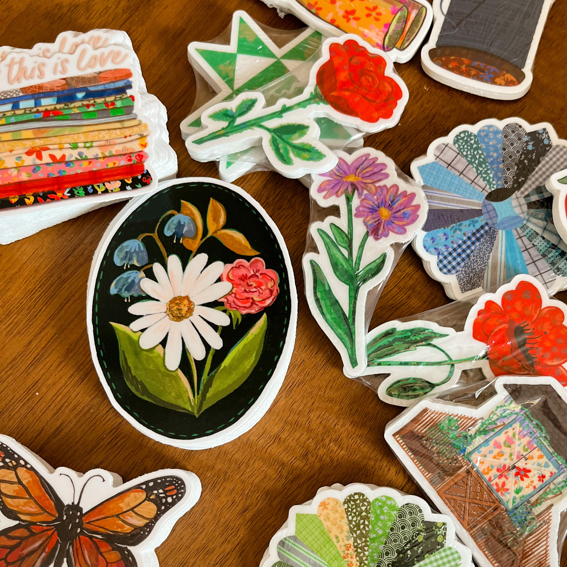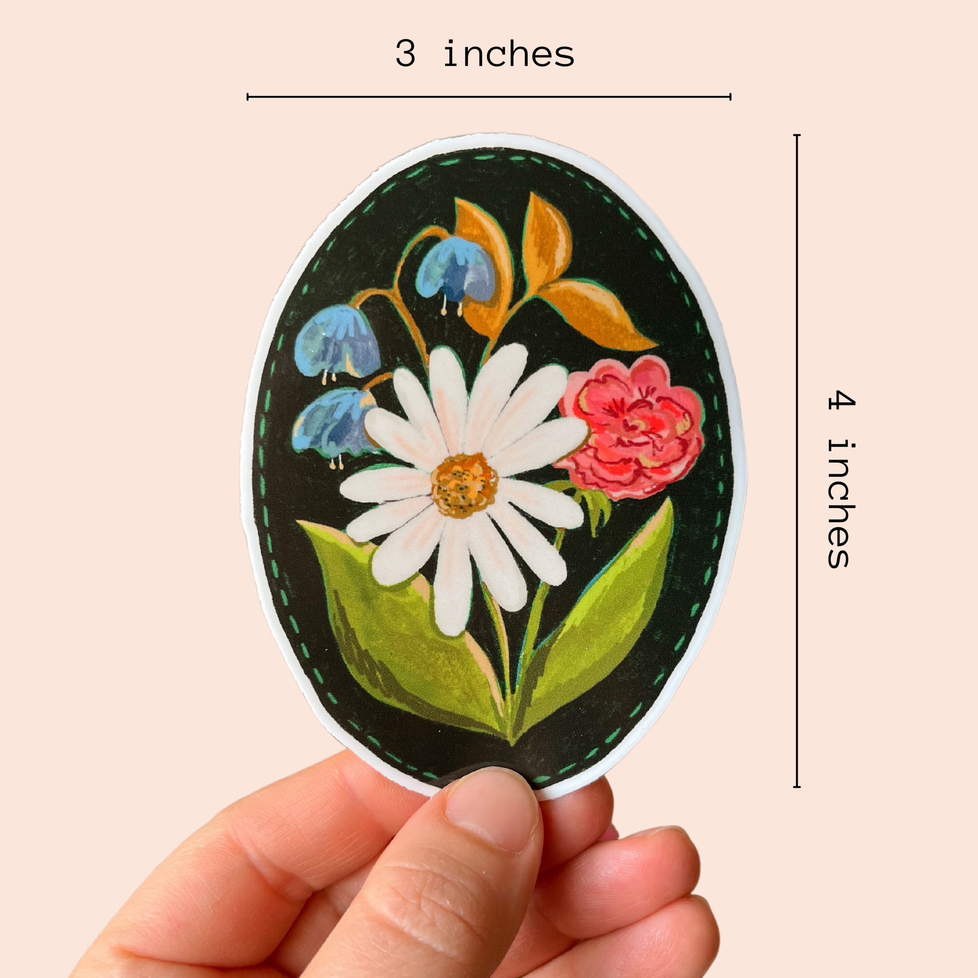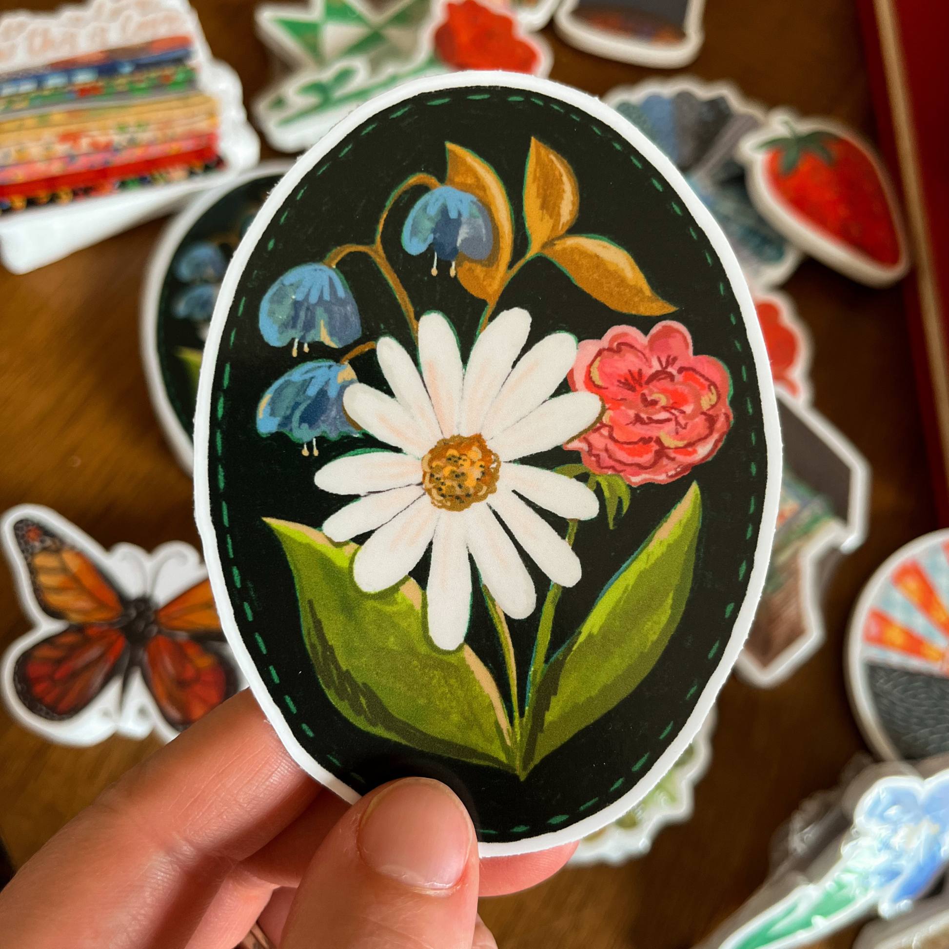 Pretty flower vinyl stickers for sewing machine, water bottle, laptop, kindle, journal, mirror, or other smooth surfaces, featuring a retro daisy and other wildflowers. Vintage vignette inspired, aesthetic decal. This moody, romantic sticker is perfect for adding a personalized touch to your belongings or as a gift for your bestie! LISTING IS FOR 1 STICKER Details: -3 x 4 inches -waterproof -high quality, flexible, tear-proof vinyl Woman-Owned Business. Designed in my home studio by the beach.