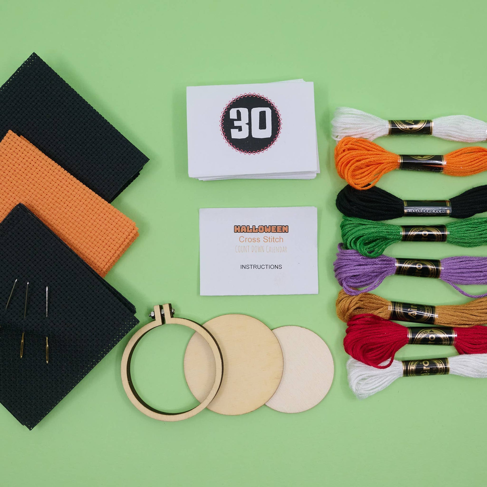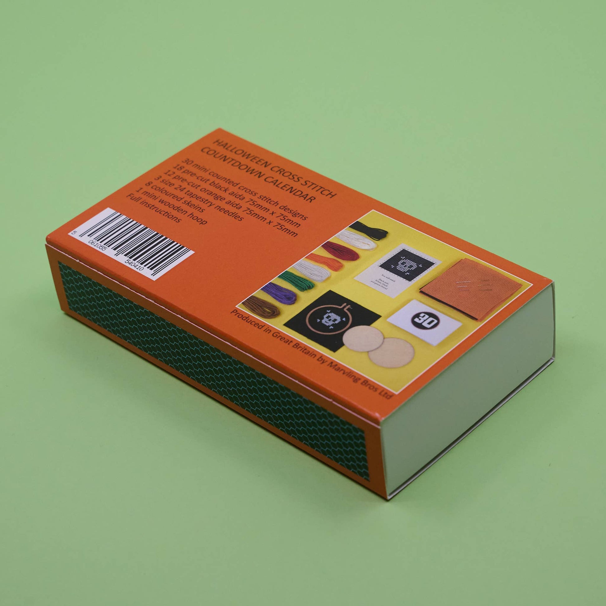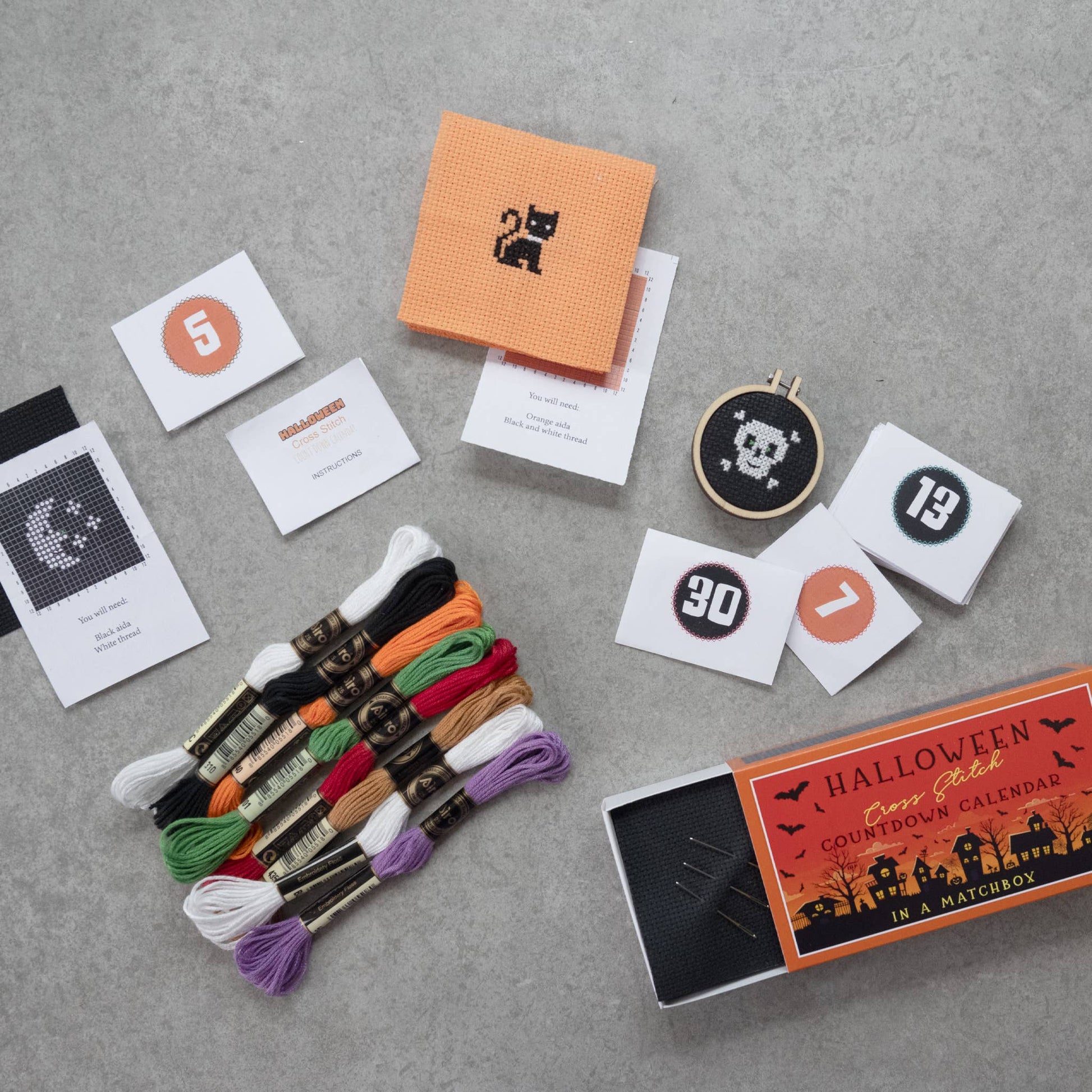 Get ready for the spookiest time of the year with our Halloween Countdown Calendar, perfect for any Halloween enthusiast. This unique Halloween calendar features 30 mini Halloween-themed cross stitches, making it an exciting countdown to Halloween. Treat yourself to this spookily cute Halloween countdown calendar. Each day leading up to Halloween, enjoy a mini, easy-to-complete cross stitch. From magical wizards to scary cats, these haunting designs can be used to create Halloween bunting, patches for your costume, or cards for friends and family. The Halloween Cross Stitch Countdown Calendar includes 30 numbered Halloween-themed designs, 18 squares of pre-cut black Aida, 12 squares of orange Aida, 8 skeins of stranded cotton, 3 tapestry needles, and a mini wooden hoop to frame your favourite one. This Halloween gift is an excellent way to create a spooky decoration for your Halloween party. made from: cotton, metal, paper dimensions: 14cm x 7.8cm x 2.9