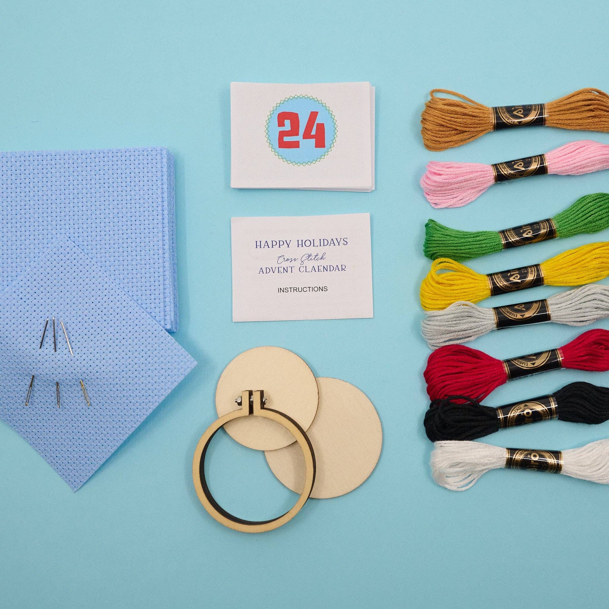 Celebrate the holiday season with our Happy Holidays Cross Stitch Advent Calendar. The perfect way to count down to Christmas, each day in December discover a delightful mini cross stitch project, from palm trees to rainbows, designed to bring the holiday spirit into your home. This unique advent calendar not only adds a creative twist to your holiday traditions but also offers the joy of crafting together, making it a wonderful gift for crafters and holiday enthusiasts alike. Our Holiday Cross Stitch Advent Calendar includes everything needed to complete 24 beautiful designs. Inside the matchbox, you'll find 24 numbered patterns, 24 squares of ready-cut blue Aida fabric, 8 skeins of stranded cotton, and 3 tapestry needles, and a mini wooden hoop to frame your favourite cross stitch.