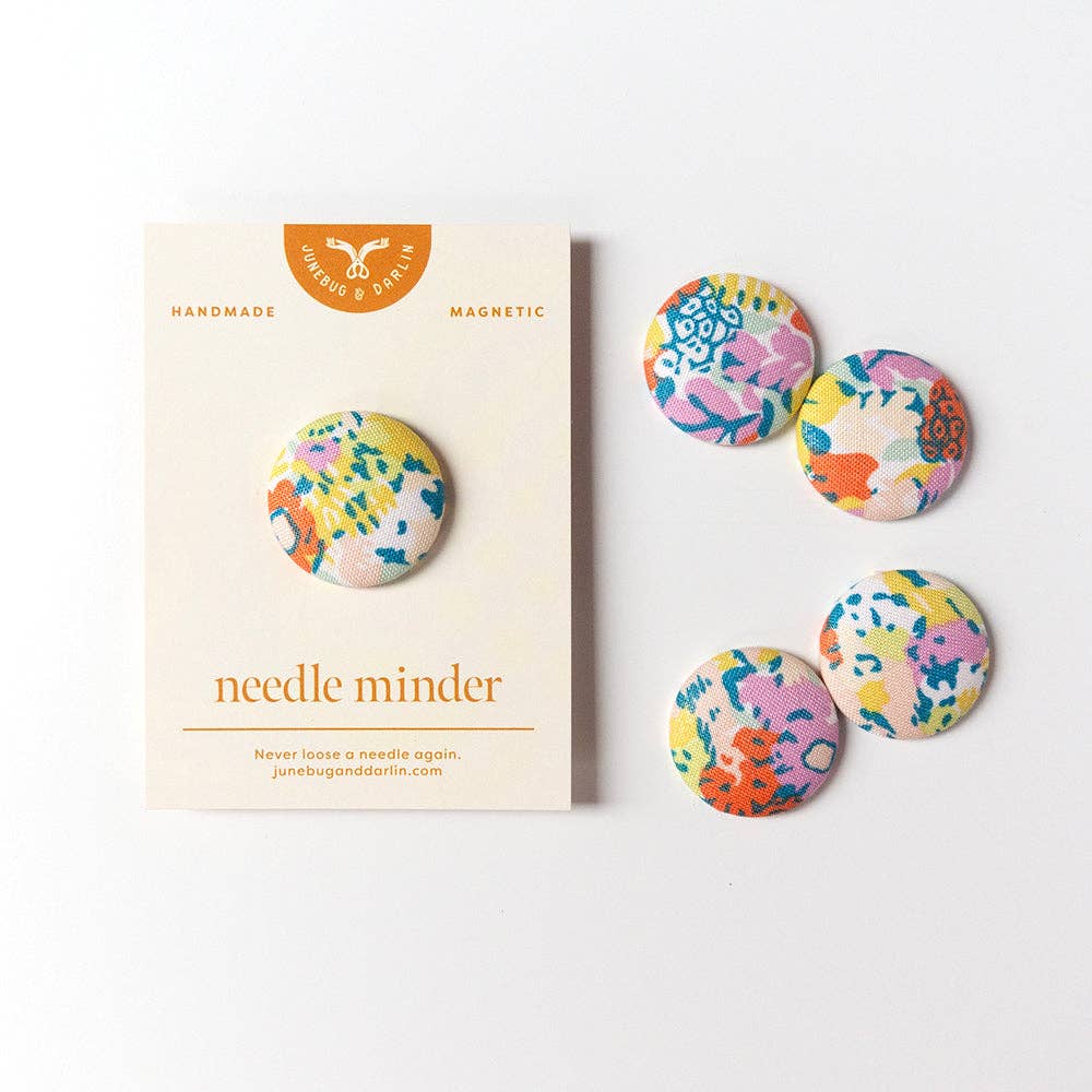 1 1/8" Needle Minder - Perfect for every size project. Needle minders are a great way to hold onto your needles without making holes in your project. This 1 1/8" needle minder is perfect for cross stitch, embroidery, quilting or any type of hand sewing. Each needle minder is made in the USA and focuses on reclaiming materials. Every piece is covered with either vintage, thrifted, or scrap fabric. Both pieces of the pair have strong magnets attached to hold multiple needles if necessary. HOW TO USE: Each piece of the button comes with a magnet attached on the back - use these magnetic pieces to sandwich around your project fabric while working or resting.