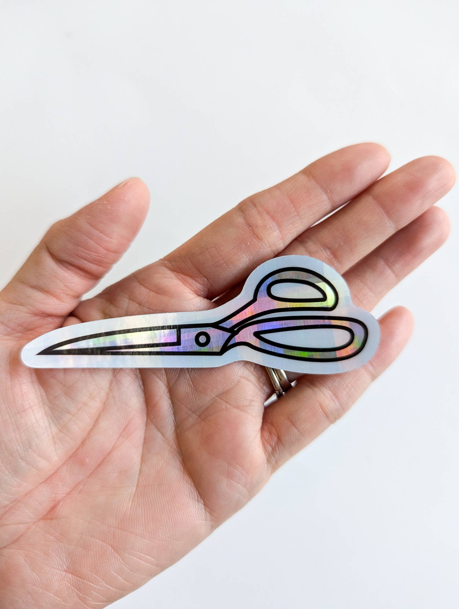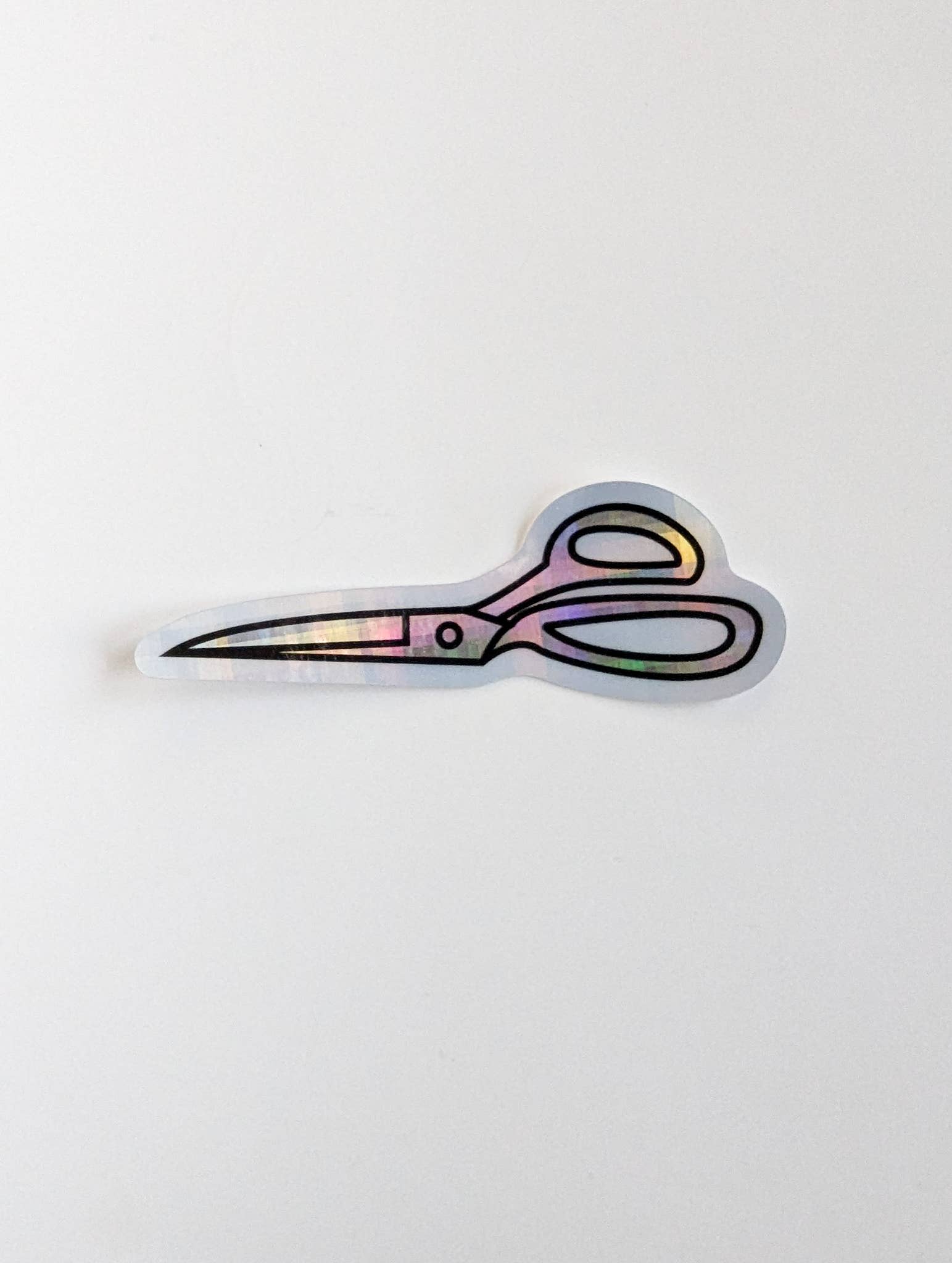 Original art by Virginia May Illustration. Add this sticker to your water bottle, sewing machine, notebook, laptop, or anywhere else you'd like. Designed alongside our Handmade. Scissors. label. Details: -Durable vinyl sticker. -UV protected. -Waterproof. -Holographic satin finish. -Made in the USA. -Approx. 1.35 in x 3.5 in