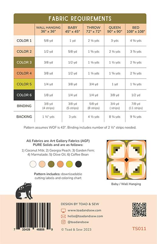 The Sky Cabin Quilt is an original pattern design by Taylor Krz of Toad & Sew. This pattern is rated as advanced-beginner and assumes that the quilter understands basic quilting knowledge and can keep a consistent 1/4" seam allowance. It is a block based pattern that is built off of the traditional log cabin block. The pattern comes with two different size blocks making a lot of different size options! It's also a great pattern to master HRTs, HSTs, and matching points.
